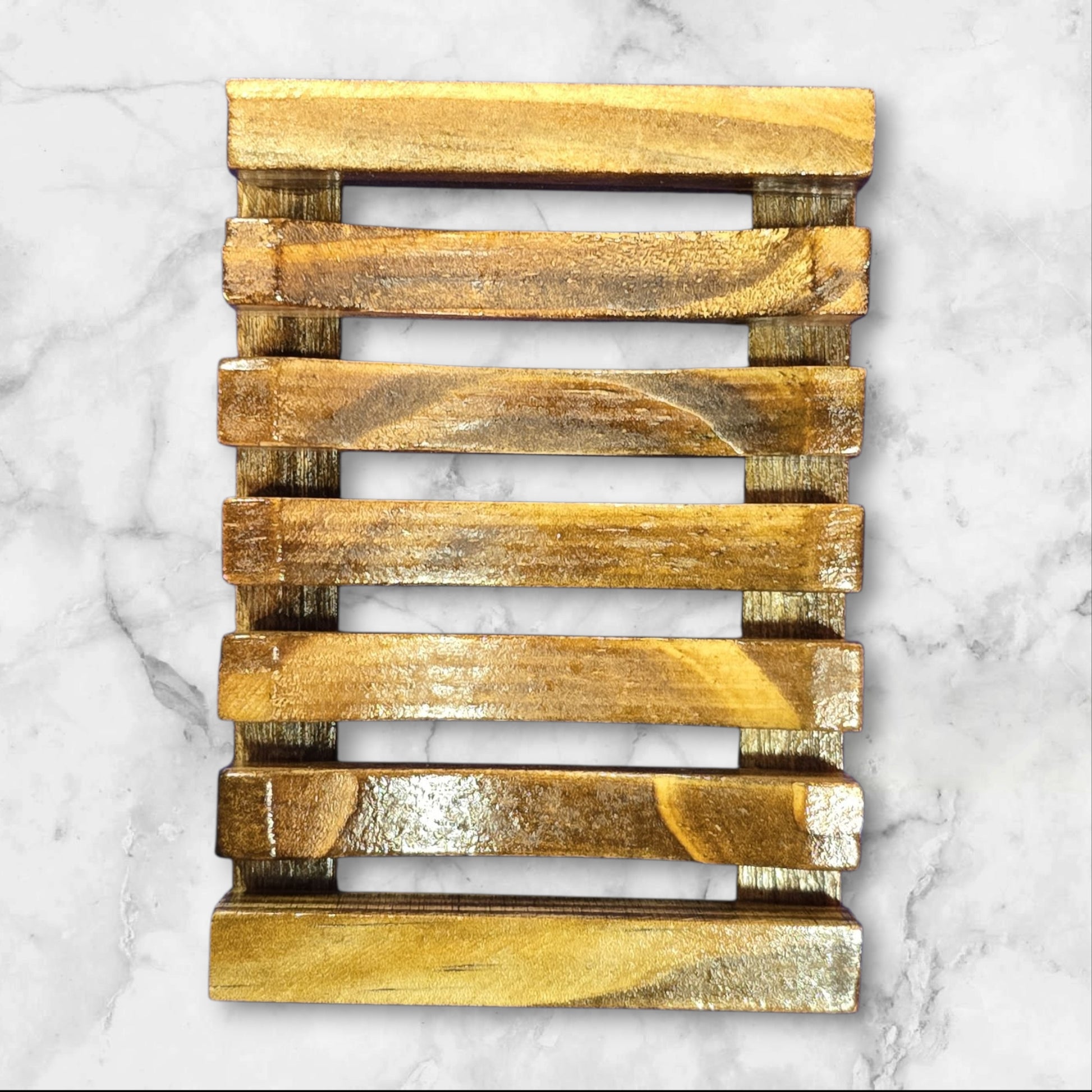 Handcrafted wooden soap dish with slatted drainage and a water-resistant, food-safe finish — keeps soap dry, prevents slimy residue, and fits standard bars.